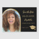 Une photo magnétique Enregistrer la carte de date pour une fête de remise de diplômes. Sur le devant : Ajoutez votre propre photo verticale du diplômé. Cadre de l'arc photo en or Faux. Un arrière - plan noir classique, un texte doré. Modèles pour un nom et une date. Le nom et le texte : Save the Date sont écrits avec un script de style manuscrit moderne. Avec un casquette, garnir de bon goût.