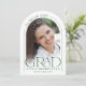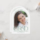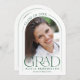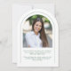 Cette faire-part de graduation minimaliste en arc vert et blanc présente une arche délicate, 2 modèles photo et une élégante typographie moderne.