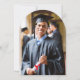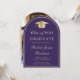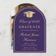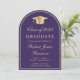 Faire-part de diplôme universitaire violet en forme d'arc officiel avec un casquette de grade d'or, le nom et l'année de classe du diplômé dans un élégant script d'or, leur université, major et les honneurs dans la typographie classique de serif d'or, et leur photo au dos de la carte.
