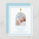 Un fond blanc, décoré d'un cadre bébé bleu, et une croix dorée Personnalisez et ajoutez une photo nom et détails. Texte bleu. Cadre photo en forme d'arche.