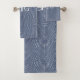 Un intéressant motif d'arches bleues recouvertes de serviettes de bain à points blancs. Initiales ajoutées pour personnaliser le jeu. Un matelas à plateau-coussin avec literie de qualité supérieure est à votre disposition.