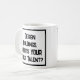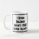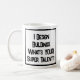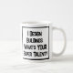 Drôle slogan sur une tasse qui dit "Je conçois des bâtiments. Quel est VOTRE super talent ?" Mug pour un architecte. Texte en gras noir et blanc.