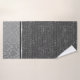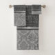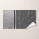 Sur cet ensemble de serviettes élégant est un fond gris sont des hiéroglyphes égyptiens argent séparant par un ruban argent et noir un motif damassé argent. Mystérieuses vibes chic.