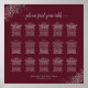 Ce tableau de sièges mariage comprend des assignations de table pour 150 personnes à 15 tables. Le design est simple mais élégant avec du texte gris sur un arrière - plan bordeaux ou marron. Le titre est écrit en calligraphie écriture dentée et il y a des décorations florales en faux feuille d'argent dans les coins. Une façon élégante, chic et sophistiquée d'aider vos clients à trouver leur place à la réception.