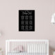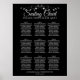 Faites de votre réception de mariage une belle avec ce tableau de 9 places. Conçu dans le cadre de notre Silver Foil Elegant Wedding Suite, il présente un design simple mais élégant avec du texte gris argenté pâle sur un arrière - plan noir avec une bordure florale en faux feuille argent. Ce graphique montre les affectations de table pour 90 invités.