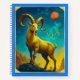 Journal in a majestic ram standing atop rocky terrain, symbolizes the sun sign Aries. Set against a cosmic backdrop with a glowing red planet Mars, the ram's bold horns and intense gaze evoke strength, courage, and a fiery spirit.