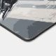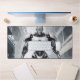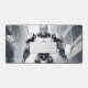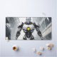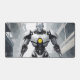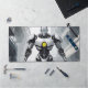 Dominate your gaming setup or creative workspace with a desk mat that radiates pure sci-fi power. This massive horizontal canvas flawlessly showcases a spectacular, cel-shaded illustration of a highly advanced, white-armored cyborg. Set against a gritty, desaturated background of a ruined industrial city, the android's glowing yellow chest core and piercing blue eyes create a fierce, intimidating focal point that captures the ultimate mecha and cyberpunk aesthetic.