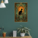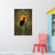 Placé dans un grand cadre de cathédrale sarcelle, un chat noir royal est assis sous un orbe céleste orange brillant. Le dégradé doux et les arches symétriques évoquent un sentiment de grandeur paisible, en faisant un centre de table apaisant mais somptueux pour tout espace sophistiqué.