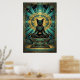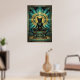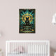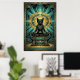 Ce majestueux chat noir art déco trône sur un piédestal pyramidal à marches sous un disque solaire doré et des motifs de bijoux géométriques sarcelle. La composition symétrique et la riche palette des années 1920 évoquent un luxe ancien parfait pour les intérieurs exotiques, les bureaux et les amateurs de chats à la recherche d'une décoration murale sophistiquée et culturellement inspirée avec un attrait intemporel.