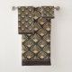 Art deco gold fan pattern bath towel set featuring a repeating geometric fan motif inspired by classic 1920s design. The warm gold pattern sits against a rich dark brown background, creating a sophisticated palette that feels both vintage and modern. A subtle gold border detail adds structure and decorative framing, enhancing the timeless art deco aesthetic. This elegant geometric design pairs beautifully with brass fixtures, marble surfaces, and warm neutral interiors, bringing bold pattern and refined glamour to the bathroom.