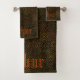 Le logo de Arthur, sur un motif de lions en spirale abstrait, est présenté sur ce somptueux ensemble de serviettes