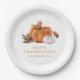 Assiette en papier de Thanksgiving citrouille. Ces assiettes en papier Joyeux Thanksgiving mignonnes et élégantes présentent de belles citrouilles orange brûlé et des florales automnales aquarelles blanches. (Changez facilement la police de Thanksgiving à Friendsgiving ou tout autre message que vous souhaitez.) Trouvez des articles assortis dans les Invitations de dîner Chic Thanksgiving et Friendsgiving.