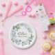 Un très joli couronne de fleurs de rose bleue entoure le nom de la mariée et la fête de mariage. Les roses roses sont nichées dans des feuilles d'eucalyptus vert sauge doux. Le nom de la mariée est écrit dans une écriture féminine pour le rendre très spécial.
