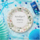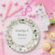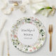 Autour d'un cadre rond central, il y a des fleurs roses douces accentuées par des feuilles vertes et de petites fleurs blanches. L'arrangement est symétrique, créant une apparence harmonieuse. Le fond blanc amplifie la beauté des détails floraux, rendant le design charmant et raffiné.