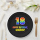 Cette plaque d'anniversaire amusante, colorée et joyeuse comporte un grand nombre de "18" et le message "HAPPY BANTHDAY", tous deux dotés d'une couleur motif inspirée du gradient du spectre arc-en-ciel, ainsi que d'un nom personnalisé jaune audacieux. Il possède un arrière - plan noir. Des plaques de papier sur le thème de l’anniversaire comme celle-ci pourraient être amusantes à utiliser lors d’une fête organisée pour célébrer le 18e anniversaire de quelqu’un. [~Z0000488]