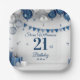 Un design élégant pour une plaque de papier fête de 21e anniversaire. Comprend des ballons bleus et argentés et un pennant avec du texte bleu. Tout le texte peut être modifié au besoin. Vaisselle parfaite pour votre table de fête.
