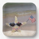 Starfish avec lunettes de soleil et bikini dans le sable de plage tenant un drapeau américain pour 4 juillet Party