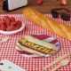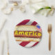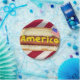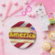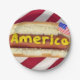 hot dog sur l'assiette du drapeau américain avec moutarde et petit drapeau pour 4 juillet fête