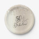 Plaques de papier de fête de 50e anniversaire de fille et chic avec "50 & Fabulous" écrit dans un élégant script élégant contre un arrière - plan de champagne en faux feuille d'or, avec de la fausse parties scintillant d'or coulant du haut.