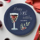 50e Anniversaire Rouge Vin Rose Aquarelle Marine Plaques en papier bleu. Le design est assorti d'un verre de vin rouge aquarelle, de roses et de brindilles sur un arrière - plan bleu marine. Le texte est en blanc et est entièrement personnalisable - personnalisez-le avec votre nom et n'importe quel âge.