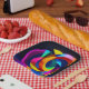 Colorful geometric shapes cover this 7" square paper plate. This unique design will add color and vibrancy to your party decor!