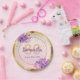 Une plaque en papier féminine, girly et chic pour une fête de 80e anniversaire. Glamour avec élégant et moderne avec un or rose doux, fond rose pâle. Avec des cadres en faux or, et des fleurs à l'eau couleur violet et violet et violet et de la pluie de confettis dorés. Modèles pour le nom, l'âge et la date. Lettres violettes et dorées.