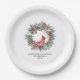 Elegant watercolor red cardinal framed by a classic winter pine wreath. Red and white flowers, berries and pinecones add to the greenery. Three lines of text let you customize your party supplies.