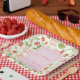Features watercolor strawberries and scalloped pink border