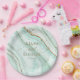 You get both glamour and high impact with this coordinating wedding set that features abstract agate patterns, textured with faux-crystals and highlights in glittering faux gold foil. Striking color combinations, like this suite with it's soft pastel palette from mint green to teal blue, create the background for the pieces in this coordinated set. This wedding paper plate features all the above plus elegant calligraphy and a template to easily add your names and wedding date. View the collection link on this page to see all of the matching items in this beautiful design or search ID827 to see additional color choices.