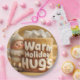 A charming and sweet 3D render or miniature photograph featuring an adorable, fluffy beige felt gnome standing next to a large, textured fabric mug. The gnome has a large white beard, pink cheeks, and a beige knitted hat. The oversized mug is labeled with the message "Warm Holiday Hugs" in white, marshmallow-like letters, and is overflowing with soft white marshmallows. The scene is set against a warm, soft ochre background, emphasizing the cozy, comforting, and whimsical nature of the image.