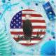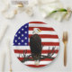 Un aigle à tête blanche scanne le ciel de sa perche sur une branche d'arbre ; superposé sur un drapeau des Etats-Unis.