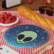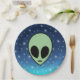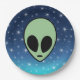 Une tête alien verte avec de grands yeux noirs ovales et une petite fente noire pour une bouche. L'arrière - plan est un dégradé foncé à bleu clair, parsemé d'étoiles blanches.