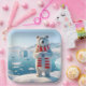 Un ours polaire portant un foulard rayé rouge et blanc se dresse sur un paysage glacé, tenant ses pattes en forme de coeur