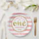 Plaques papier de fête de premier anniversaire imprimées sur mesure avec un modèle facile à utiliser pour la personnalisation do-it-yourself conception. Ce thème tendance et adorable pour la fête de la première année de votre petite fille présente des polices de caractères en lettres, des accents de feuille d'or faux et un arrière - plan rayé d'aquarelle rose. Le texte dit "Oh quel plaisir d'être UN" en lettres roses et or. Utilisez les outils de conception pour ajouter le nom de votre fille ou un autre texte personnalisé ci-dessous.
