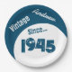 Anniversaire 1945, 80e anniversaire en 2025, Fournitures de fête en bleu et blanc avec un texte Modèle à éditer pour le nom de l'honoraire d'anniversaire spécial. Décorer l'assiette en typographie cool est une police qui a l'air vintage et depuis... la date de l'année. Les plaques de papier sont illustrées par un arc de séparation pour un design graphique unique.