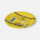 pelle de construction sur mesure cool plaques d'anniversaire pour un enfant qui aime les véhicules de construction jaune en noir et jaune. Conception de véhicule amusant pour un petit garçon qui aime les voitures et les camions. Customisez avec le nom de votre enfant sous le ruban de prudence noir et jaune.