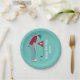 Turquoise golfeur personnalisé, portant un casquette, chemise rouge profonde et pantalon bleu, mettant une balle de golf dans une plaque de papier trou.