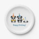 Trois adorables petits pandas en casquettes d'anniversaire assis l'un à côté de l'autre. Un heureux panda porte un tee - shirt avec "I heart panda" écrit dessus. Un autre offre un bonbon à un troisième panda qui s'est endormi.