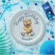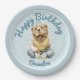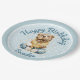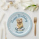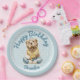 Célébrez l'anniversaire de votre enfant avec cette mignonne plaque d'anniversaire d'ours. Le design comprend un jeune ours portant un casquette de fête, jetant des confettis dans l'air. L'arrière - plan est un motif subtil bleu clair. Texte : "Joyeux anniversaire." Vous pouvez personnaliser avec un nom.