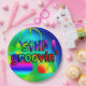 Un design graphique d'un arc-en-ciel encore en bois signe de l'artiste et designer Charmaine Paulson sur une assiette de fête.