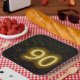 Panneau de néon de marquise illuminé sur un mur de briques foncées pour 90e anniversaire.