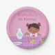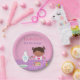 Approvisionnements de partie en plaques à papier pour assortir cette poterie peignant la fête d'anniversaire orientée ! Elle a une fille mignonne d'Afro-américain dans une peinture blanche de tablier sur un vase à poterie. Sur le plaid de pourpre la nappe se trouve de divers articles comme un plat de poterie, une palette de couleur et d'autres pinceaux. Une palette de couleur rose et pourpre girly et douce, grande pour la fille d'anniversaire d'Afro-américain ! Ajoutez votre message de partie dans l'espace fourni.