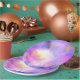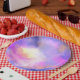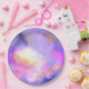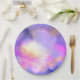 Une élégante assiette en papier, alliant douceur pastel et couleurs vives. Un tableau abstrait coloré avec une image cosmique de l'espace dans les aquarelles rose, violet et jaune. Les couleurs se mélangent et se mélangent pour créer des nuages éthérés lumineux avec de petites étoiles scintillantes partout.