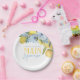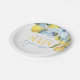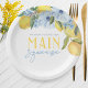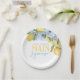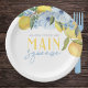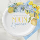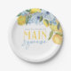Élégantes et douces assiettes en papier Blanc Citron Elle a trouvé son Grand Amour. Personnalisez avec le nom de la future mariée. Caractéristiques de belles fleurs aquarelles bleu ardoise élégantes et de citrons jaunes doux.