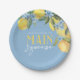 Élégant et doux citron blanc Elle a trouvé son Main Squeeze assiettes en papier personnalisées. Personnalisez avec le nom de la future mariée. Caractéristiques élégantes fleurs aquarelles ardoise bleue poussiéreuse et citrons jaunes doux sur un fond bleu.