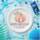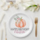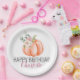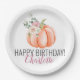 Citrouille d'aquarelle orange douce avec élément floral - plaque de papier d'anniversaire que vous pouvez facilement customiser avec le nom de la fille ou du garçon d'anniversaire. Peut également éditer du texte pour les mariages, baby showers ou autres événements spéciaux. La collection a des fournitures de partie de coordination pour un look cohésif.