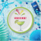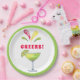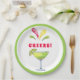 Ces assiettes en papier ludique sont décorées d'aquarelle avec des margaritas festives et le dicton "cheers !" Les couleurs sont rouge, vert et jaune.