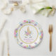 Douce licorne fille anniversaire de fête plaques de papier. Ce joli design présente des fleurs rose aquarelle, violet et bleu, un visage de licorne et des confettis de parties scintillant en faux or.