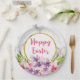 Plaques de papier personnalisées pour Pâques avec un design printanier - une texture imitation marbre en blanc compose l'arrière - plan. La couche supérieure est un cadre avec une fausse bordure en feuille d'or. De grandes fleurs de magnolia d'aquarelle rose et violet aux accents de feuilles vertes ornent le décor.