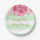 Nom personnalisable fille assiettes de baby shower de fête en vert menthe pastel clair et rayures blanches motif avec fleurs vintage rose aquarelle.